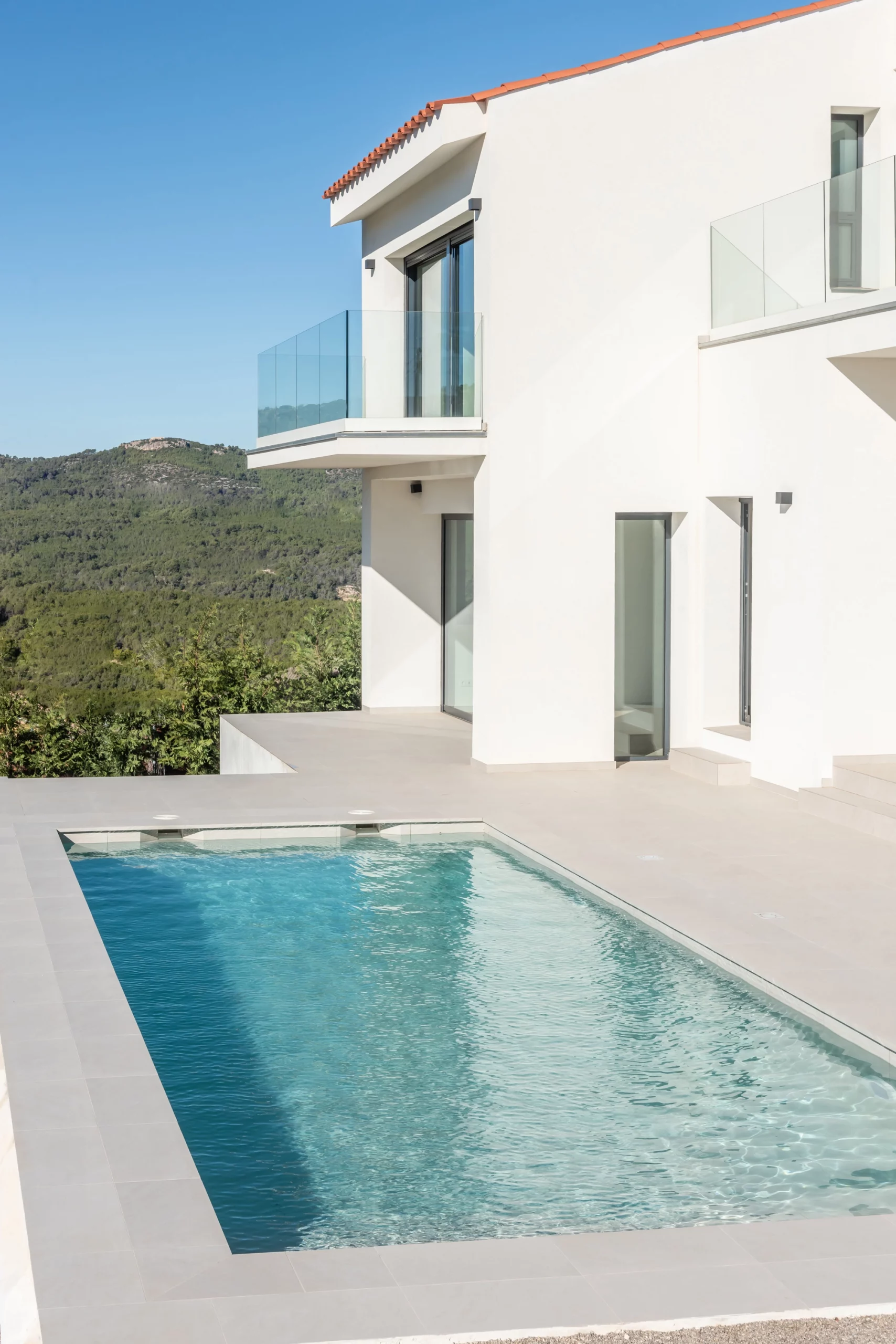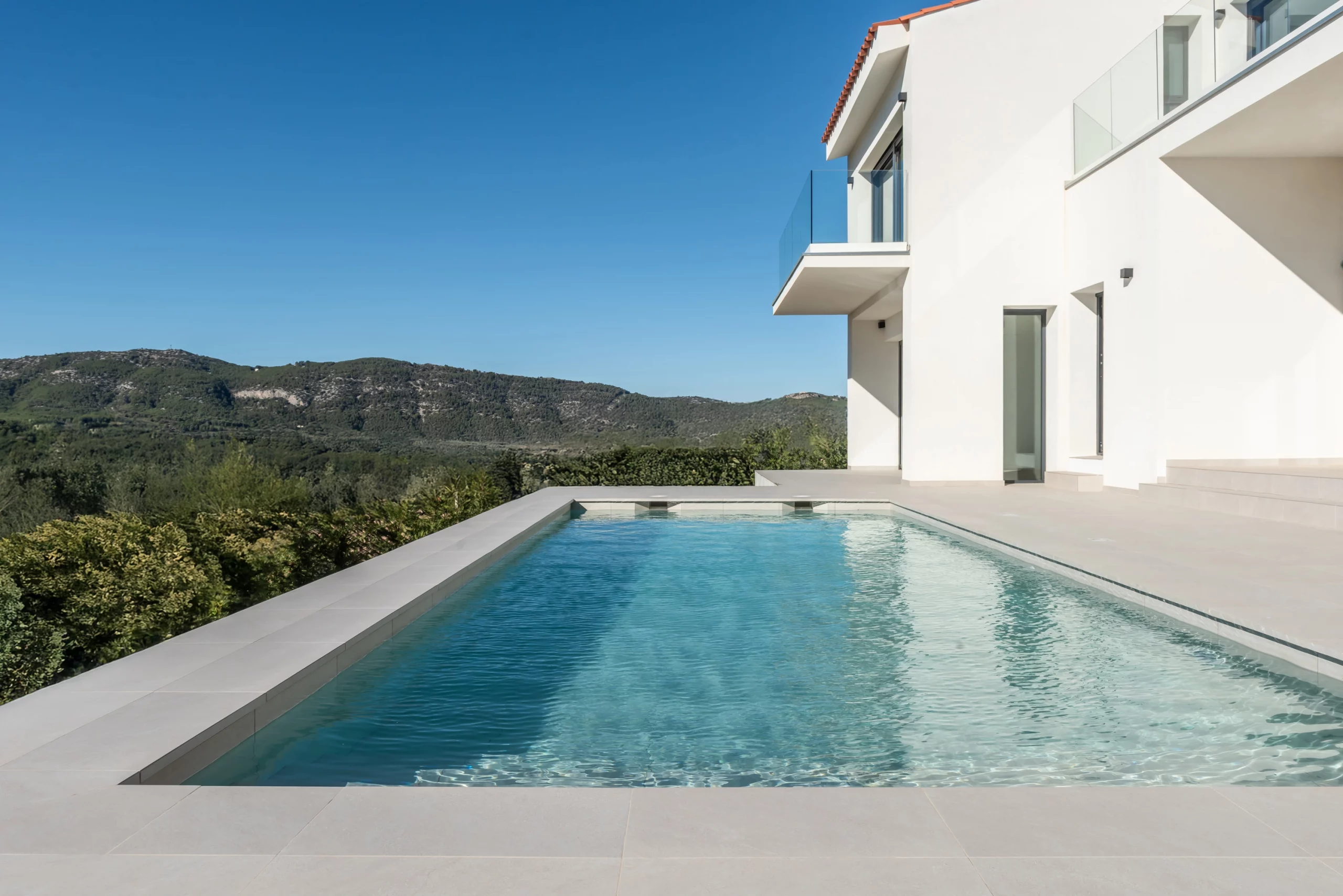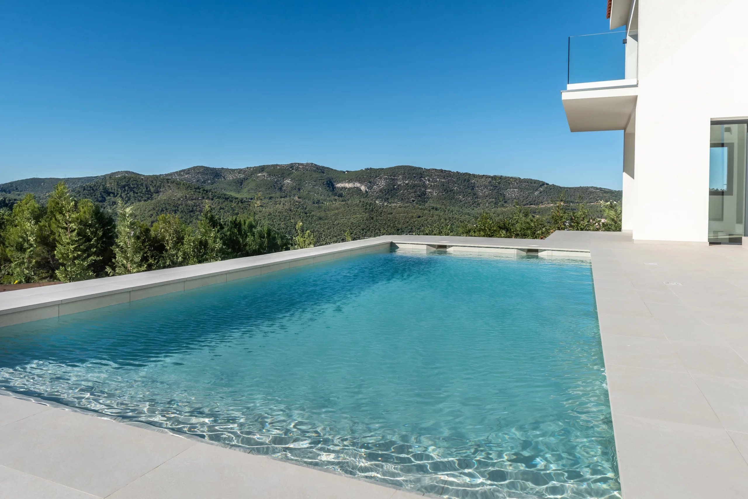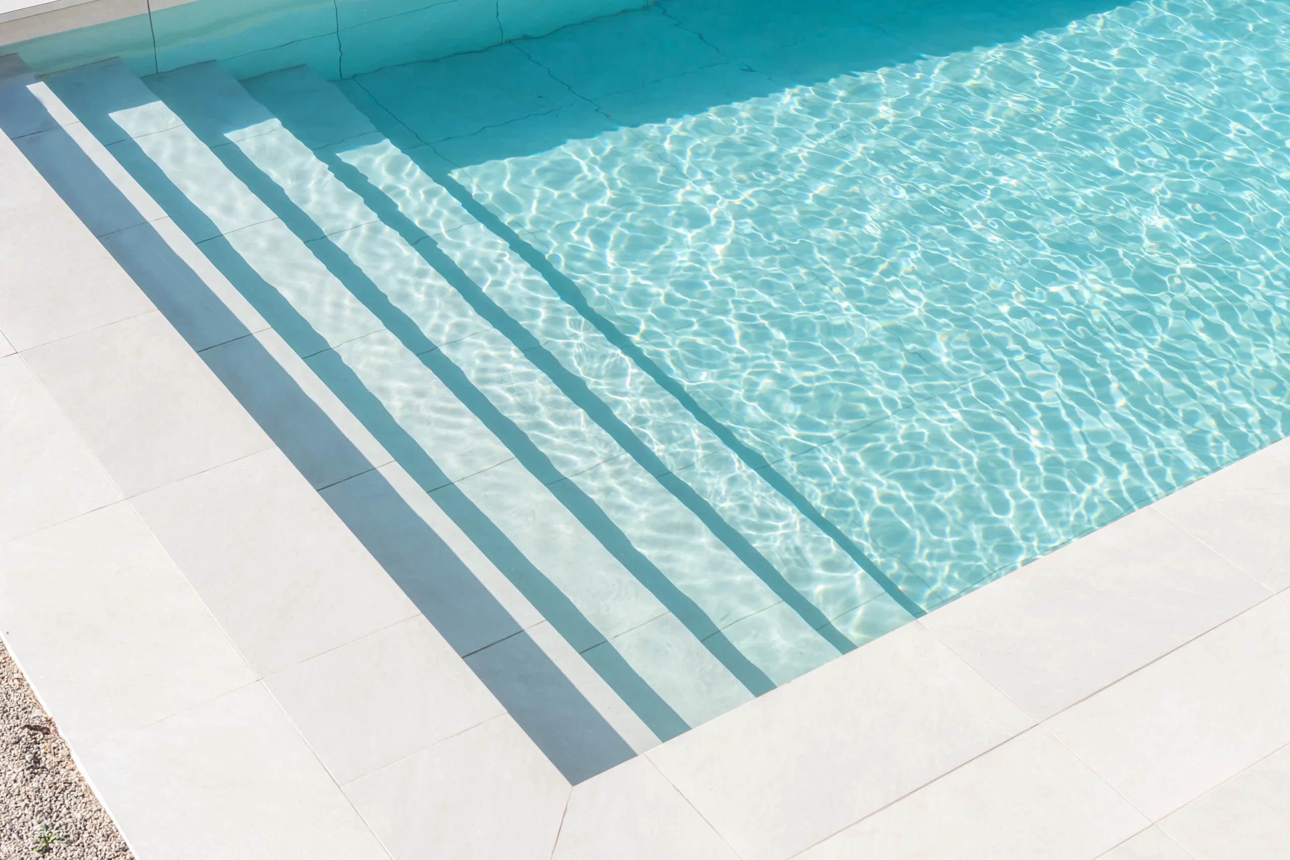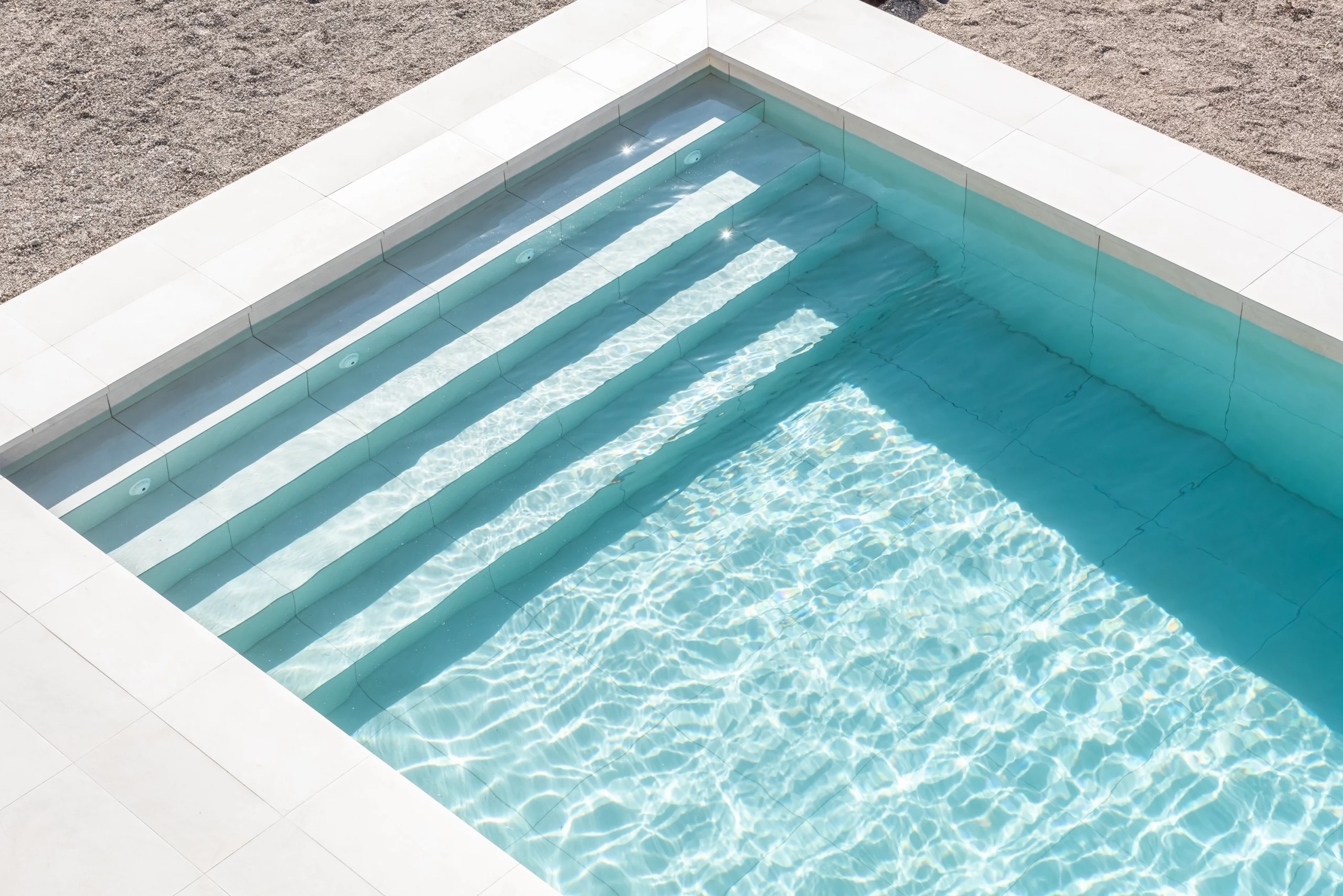 Piscina de obra Blancora 6 x 3 m con escalera y banco integrado para el descanso. Interior en mosaico color crema, corona de piedra natural apta para cloración salina e iluminación interior. Un diseño elegante integrado con zona exterior ajardinada.
