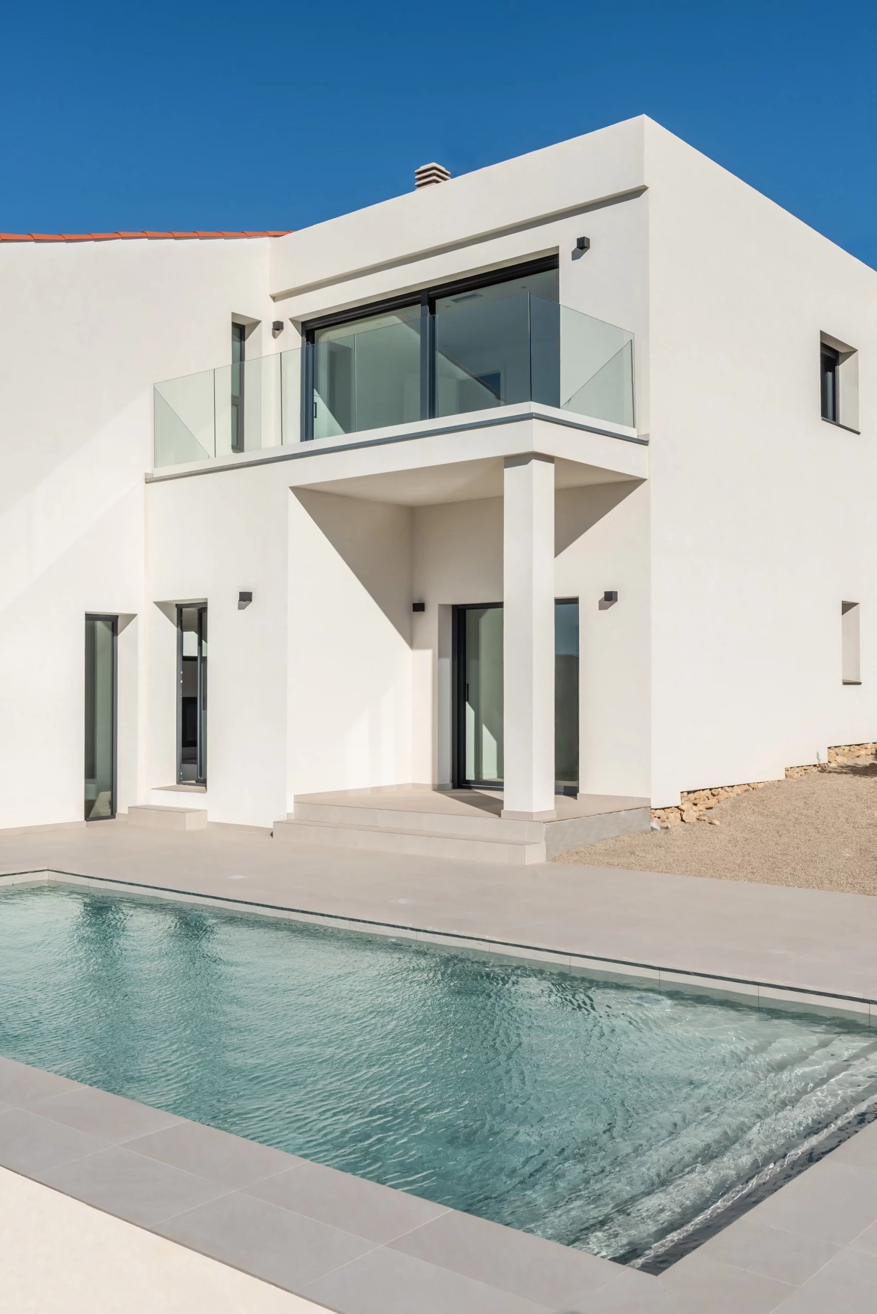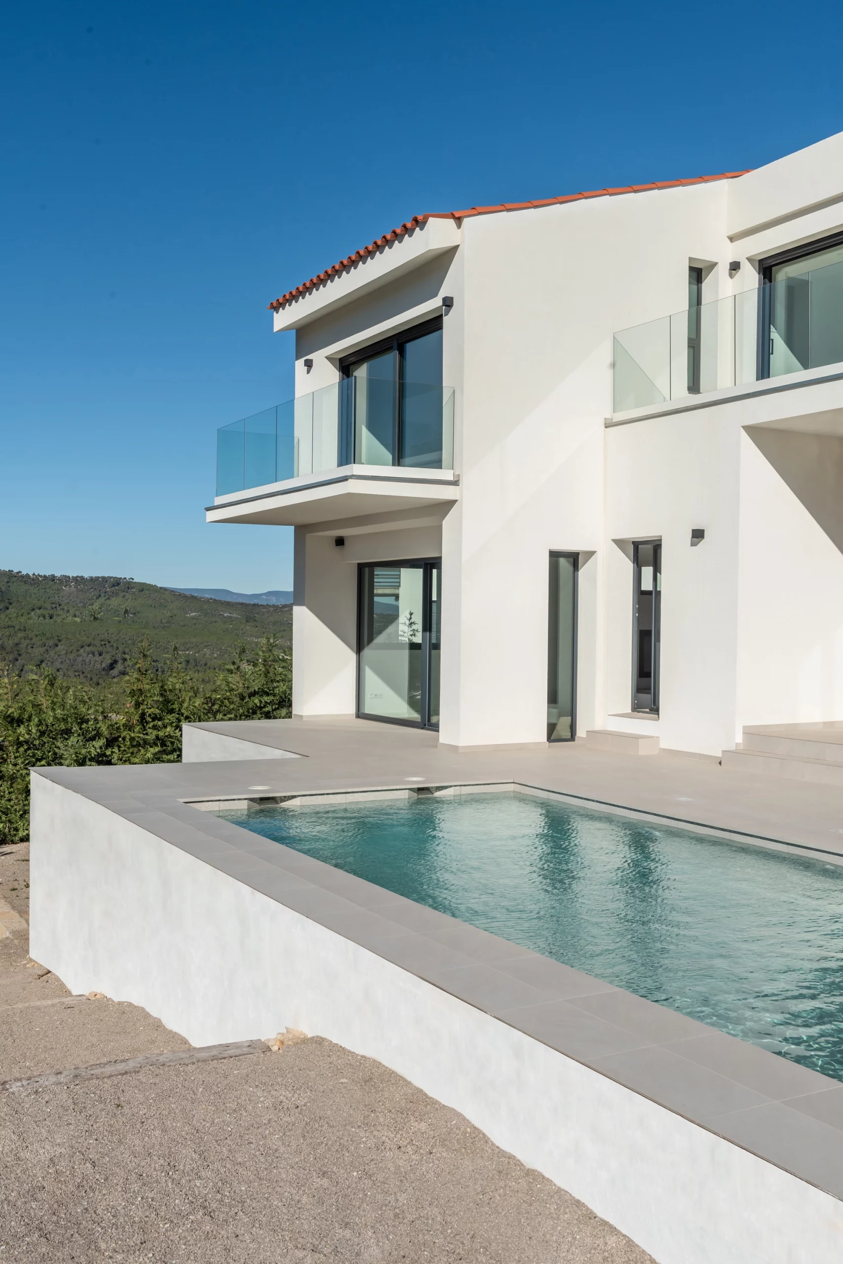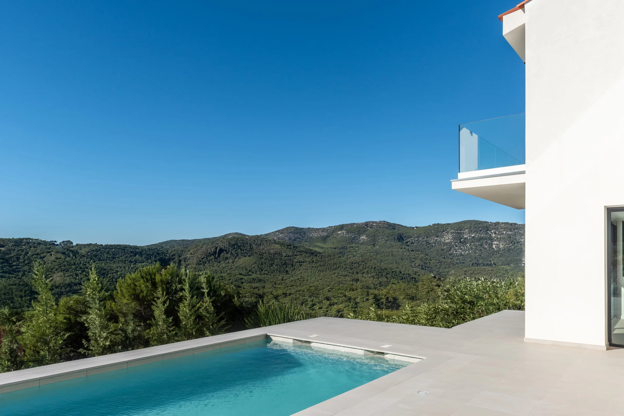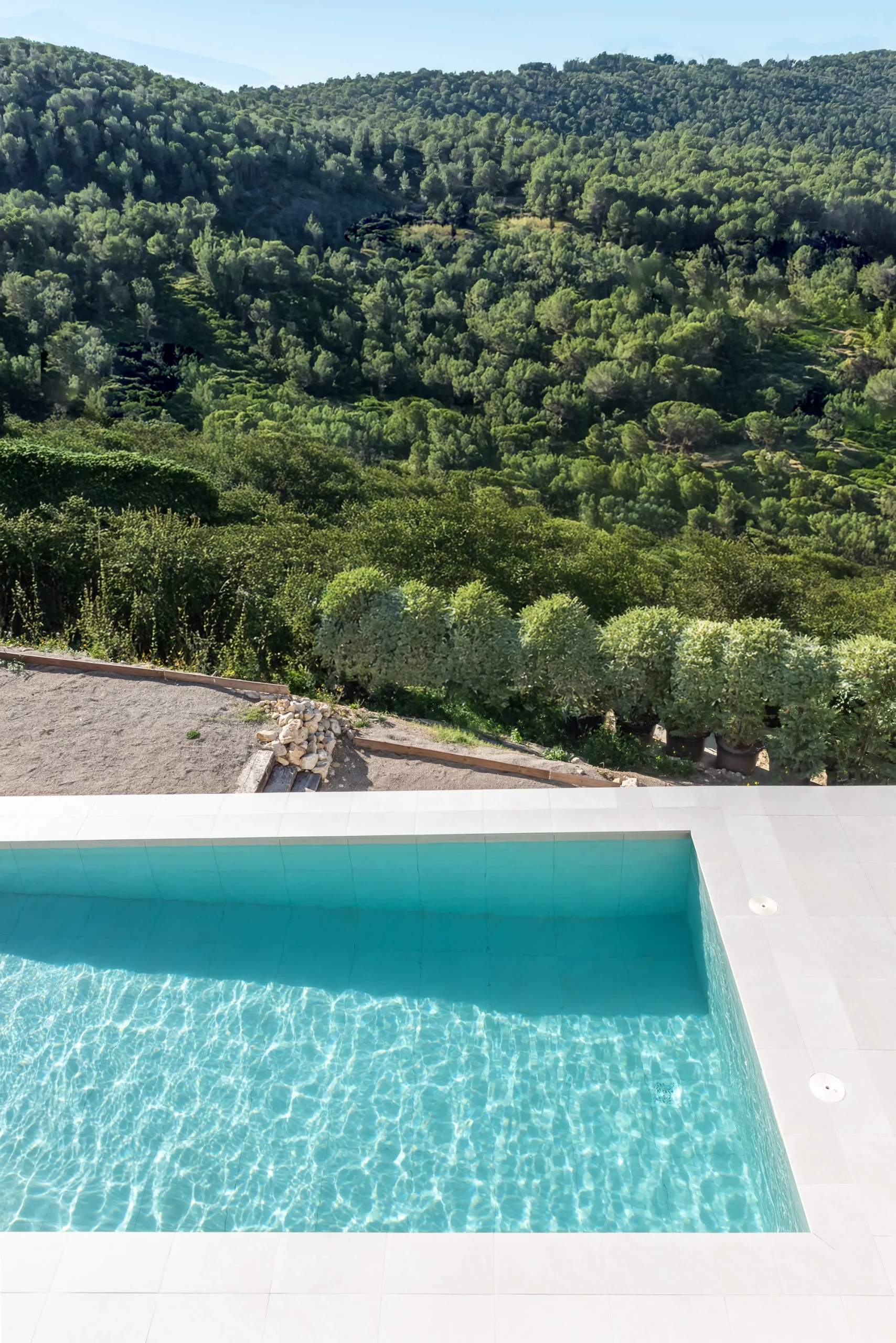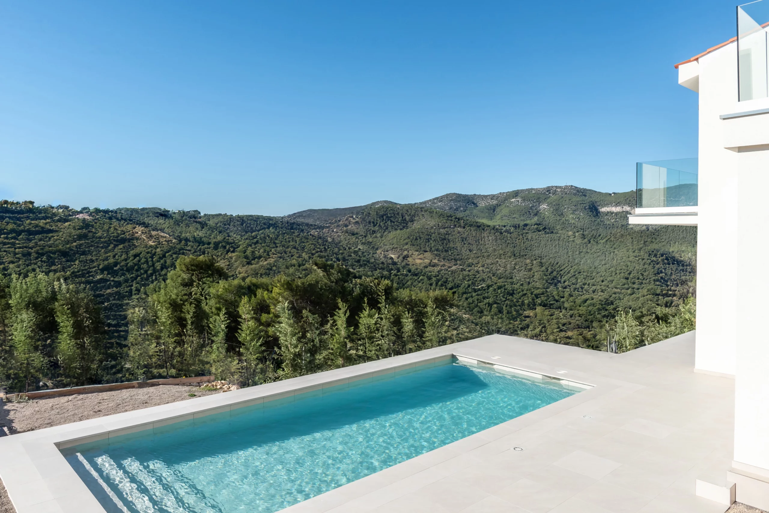 Piscina de obra Blancora 6 x 3 m con escalera y banco integrado para el descanso. Interior en mosaico color crema, corona de piedra natural apta para cloración salina e iluminación interior. Un diseño elegante integrado con zona exterior ajardinada.